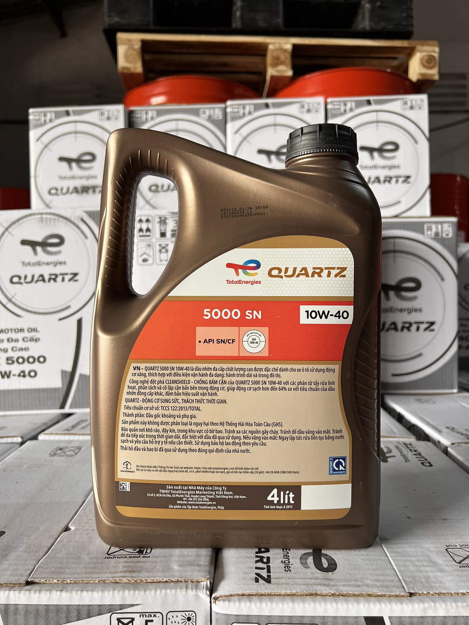 - TotalEnergies QUARTZ 5000 SN là dầu nhớt đa cấp hiệu suất cao cho xe du lịch, được thiết kế vượt các yêu cầu bôi trơn động cơ hiện đại của dầu gốc khoáng. Sản phẩm này được phát triển đáp ứng yêu cầu cho cả động cơ xăng và động cơ đi-ê-zen không trang bị bộ lọc hạt.